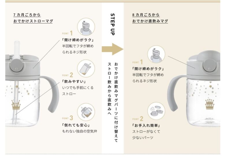 赤ちゃんはすぐに成長します。「最初はスパウト、次にストロー、最後はコップ飲み」とステップアップしたり、夏場は「保冷ができるステンレスボトル」が欲しくなったりします。