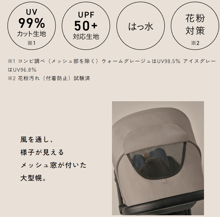 幌には、花粉対策や撥水加工、UV99%カット&UPF50+生地が使用され、日本人向けの設計となっています。リベルと同じく生後6ヶ月〜4歳頃(体重22kgまで)対応。
